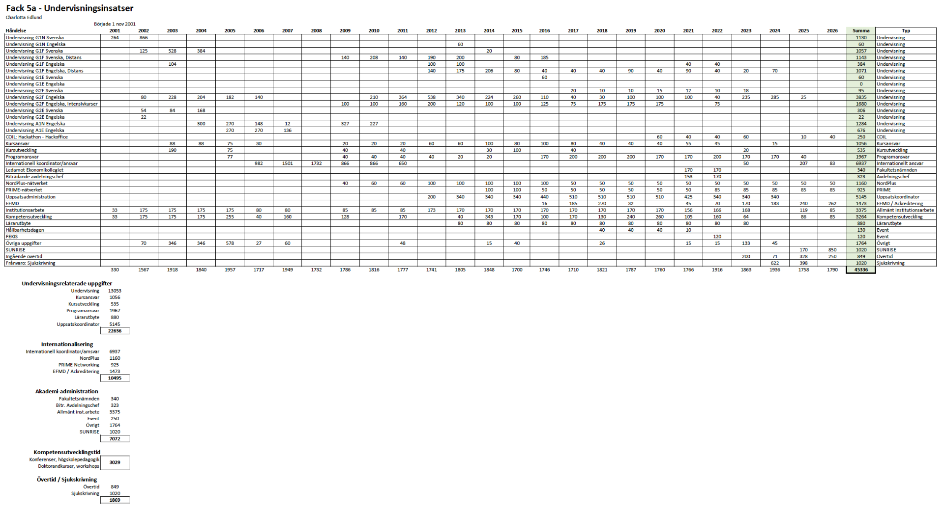 Sammanställningen av alla tjänsteplaner ovan visar på min omfattning och bredd gällande undervisningserfarenhet samt innehaft rollen som kursansvarig på alla nivåer. Sedan 2009 har jag också medverkat i lärarutbyte i olika former: via intensivkurser inom vårt internationella nätverk Nordplus och EUROWEEK (www.primenetworking.eu) och sedan 2013 gör jag ett årligen ett utbyte till ett av våra partneruniversitet i Österrike (se material nedan).
