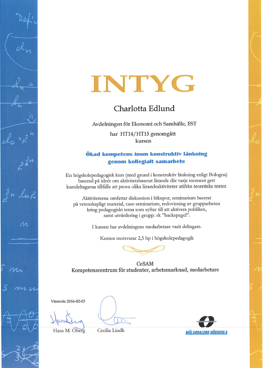 - Ökad kompetens inom konstruktiv länkning genom kollegialt samarbete 2.5hp (2014/2015)